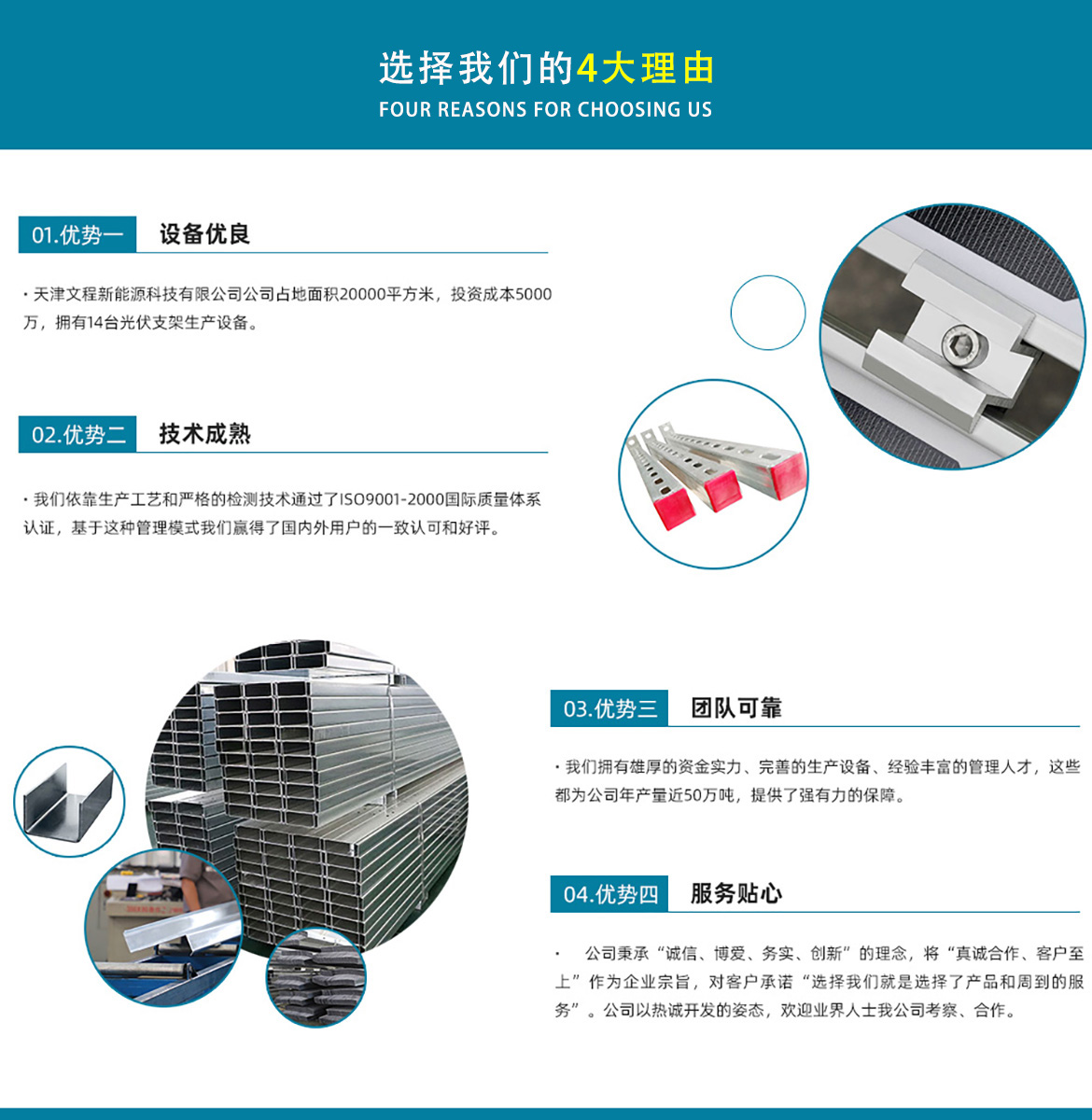 天津文程新能源科技有限公司成立于2021年,是專注于集中式、分布式、漁光互補(bǔ)和農(nóng)光互補(bǔ)等清潔能源發(fā)電的綜合性企業(yè) 公司是集設(shè)計(jì)、研發(fā)、生產(chǎn)、制造為一體的綜合型企業(yè)。公司占地面積20000平方米,注冊(cè)資金5000萬(wàn)元整。公司坐落于華北鋼鐵重鎮(zhèn)--大邱莊,距天津市區(qū)50公里、鄰104和205國(guó)道及京滬高速,交通十分便捷。 本公司擁有三個(gè)生產(chǎn)車間,其中兩個(gè)冷彎型鋼車間,一個(gè)鋅鋁鎂型鋼車間,擁有自動(dòng)冷彎成型機(jī)10條,自動(dòng)數(shù)控沖孔機(jī)10條以及焊接加工等設(shè)備。主要生產(chǎn)產(chǎn)品有:太陽(yáng)能光伏支架、各種規(guī)格的C/Z/U型鋼、抗震支架、管廊支架及整套配件等。
